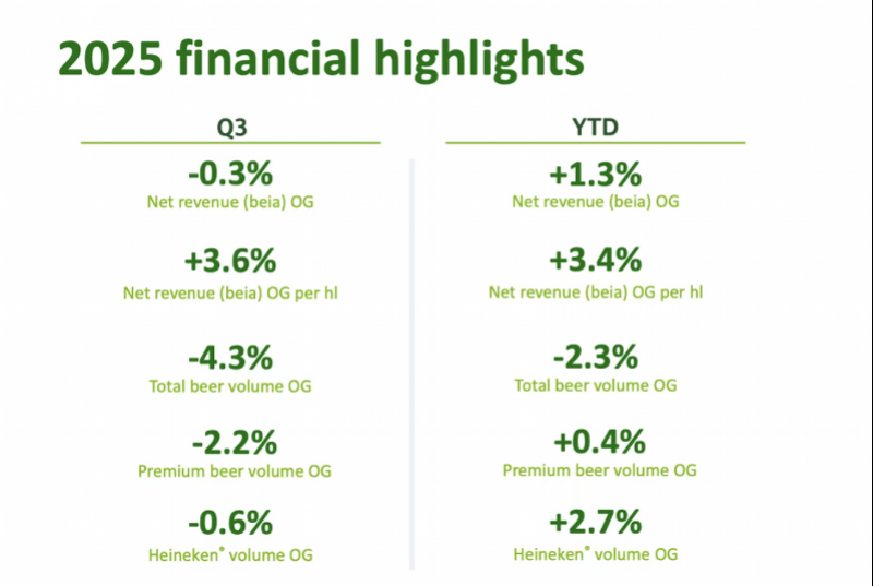 南都灣財社-酒水新消費指數課題組記者留意到,近期全球啤酒巨頭喜力啤酒發佈三季報。數據顯示,2025年前三季度,喜力啤酒公司實現收入256.36億歐元(摺合人民幣2120.96億元),同比下降4.7%;實現淨收入215.07億歐元(摺合人民幣1778.99億元),同比下降3.9%,銷量方面,前三季度累計銷量1754萬千升,同比下降2.61%。