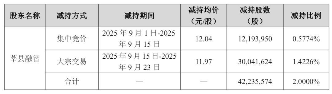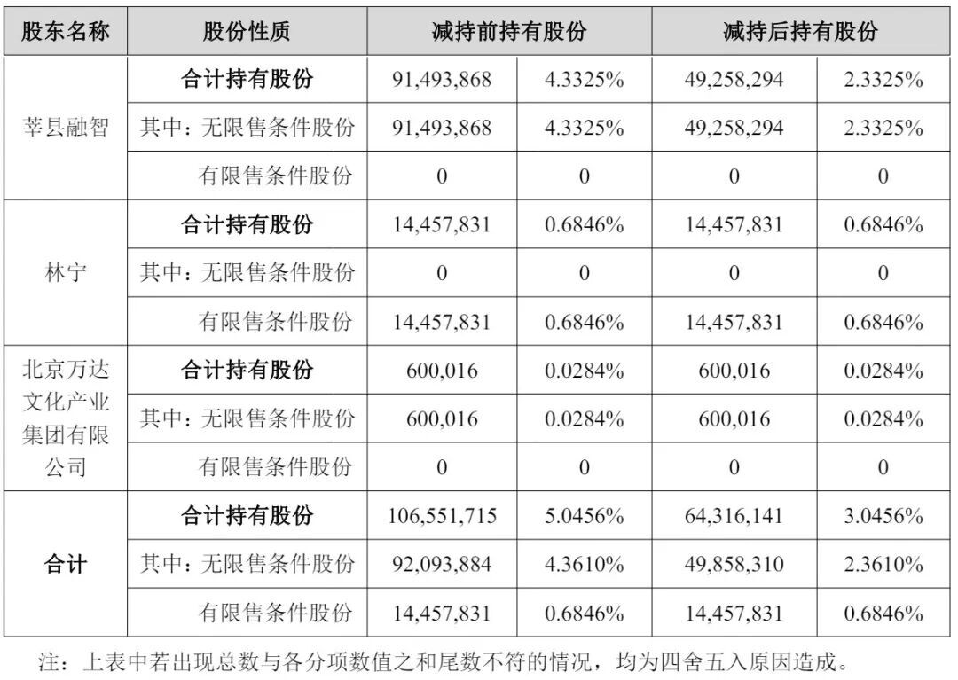 莘縣融智是萬達集團旗下基金,其2025年9月1日到9月15日通過集中競價減持0.5774%的萬達電影股權,套現1.47億元;2025年9月15日到9月23日通過大宗交易的方式減持1.4226%的萬達電影股權,套現3.59億元。