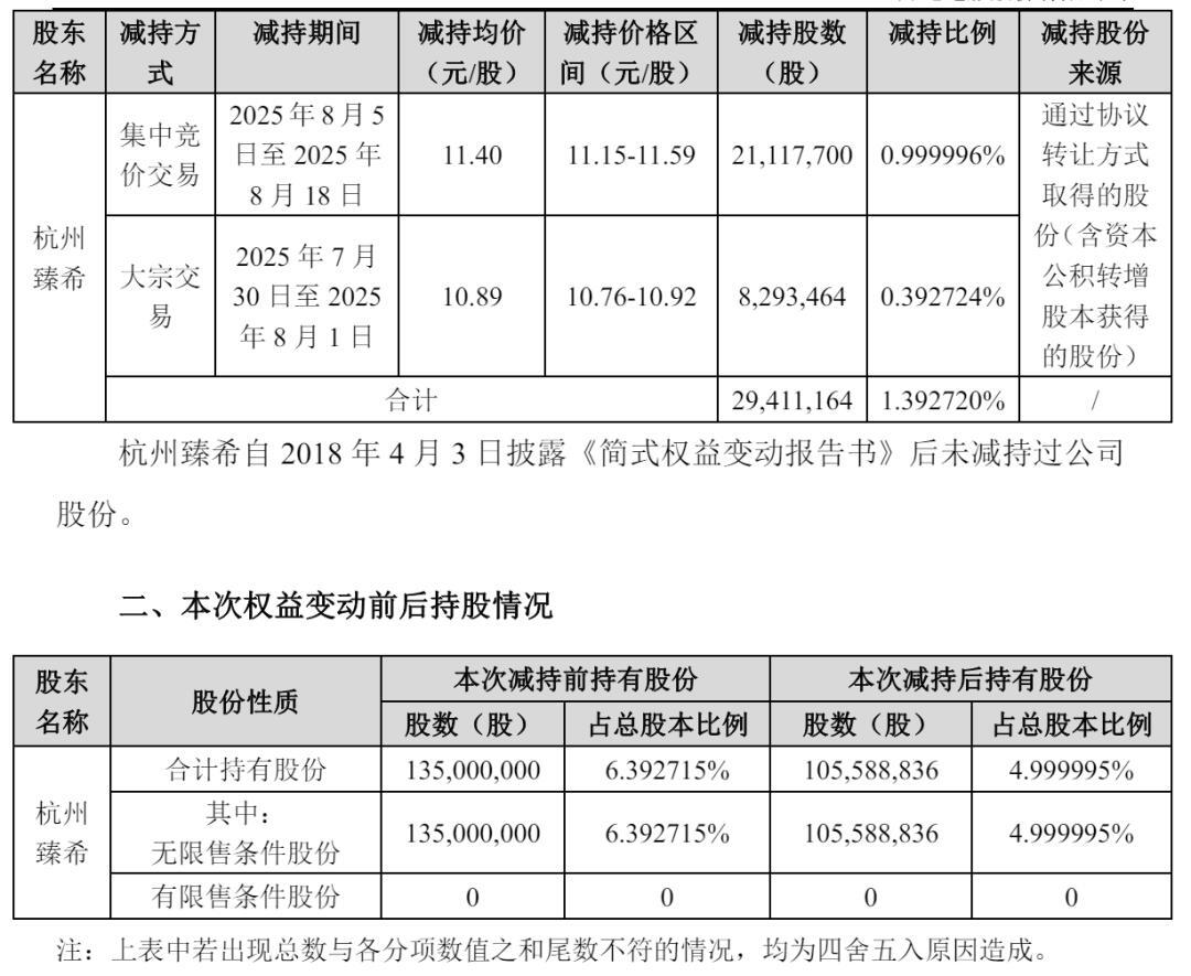 杭州臻希一共套現超過3億元,此次減持後,杭州臻希持股從6.392715%降至5%以下。