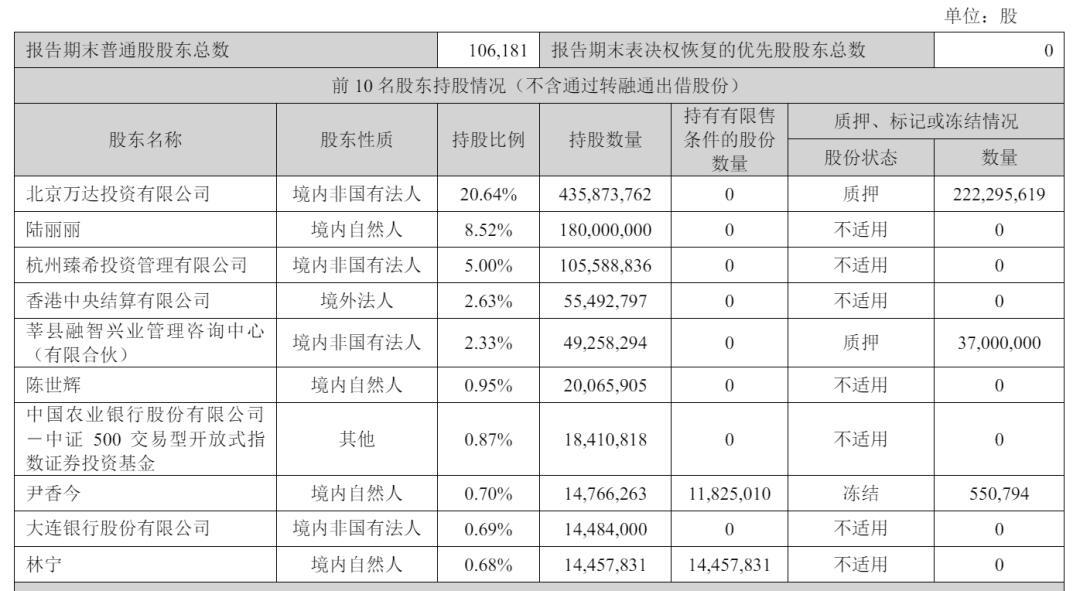 尹香今、大連銀行、萬達創始人王健林的妻子林寧進入前十股東行列,廣發證券股份有限公司、全國社保基金一一二組合退出前十股東行列。