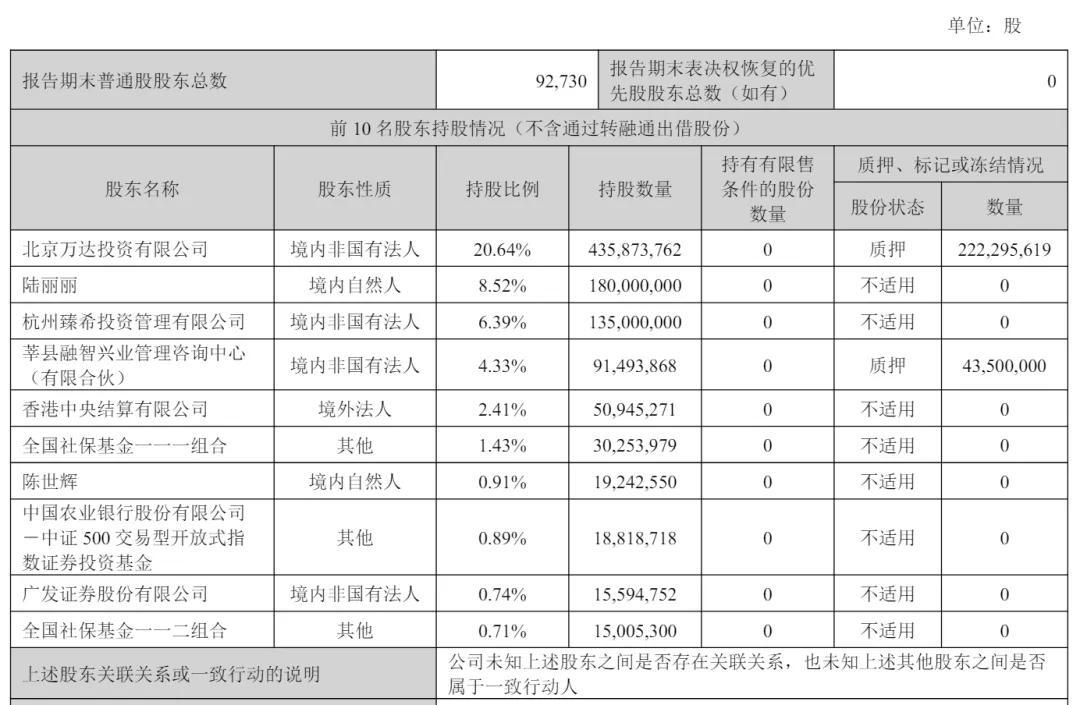 截至2025年6月30日,萬達投資持股20.64%,陸麗麗持股為8.52%,杭州臻希投資管理有限公司持股6.39%,莘縣融智興業管理諮詢中心(有限合夥)持股4.33%,香港中央結算有限公司持股為2.41%;