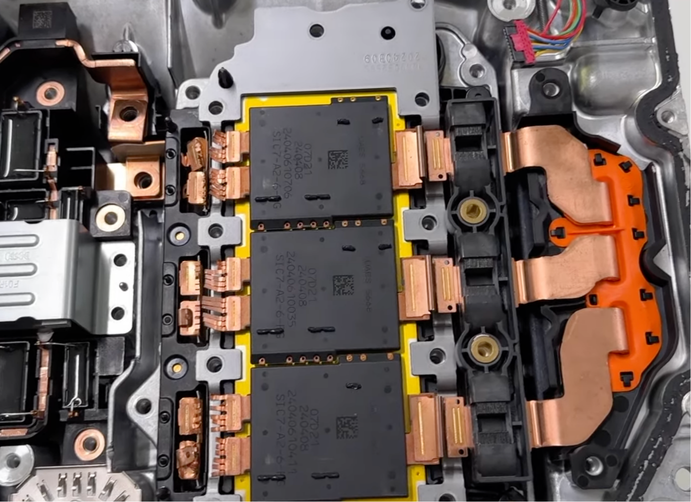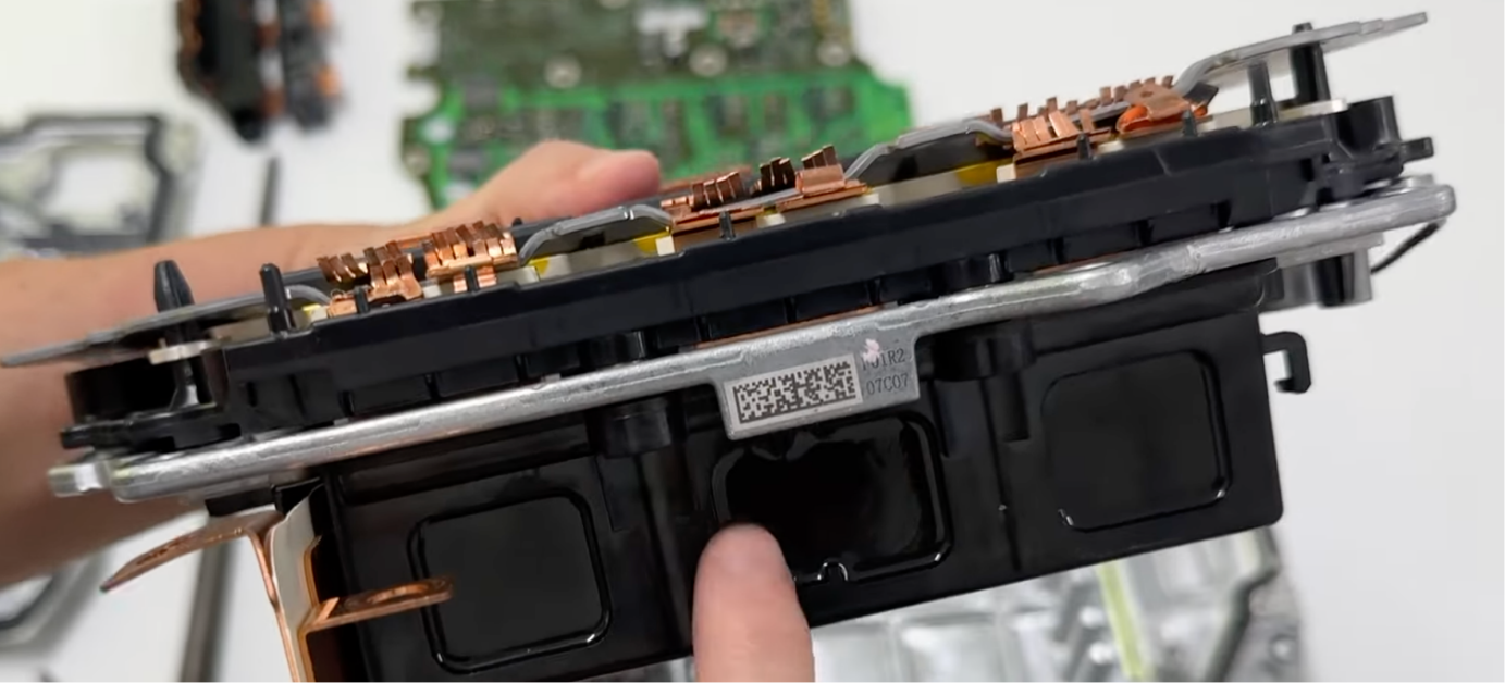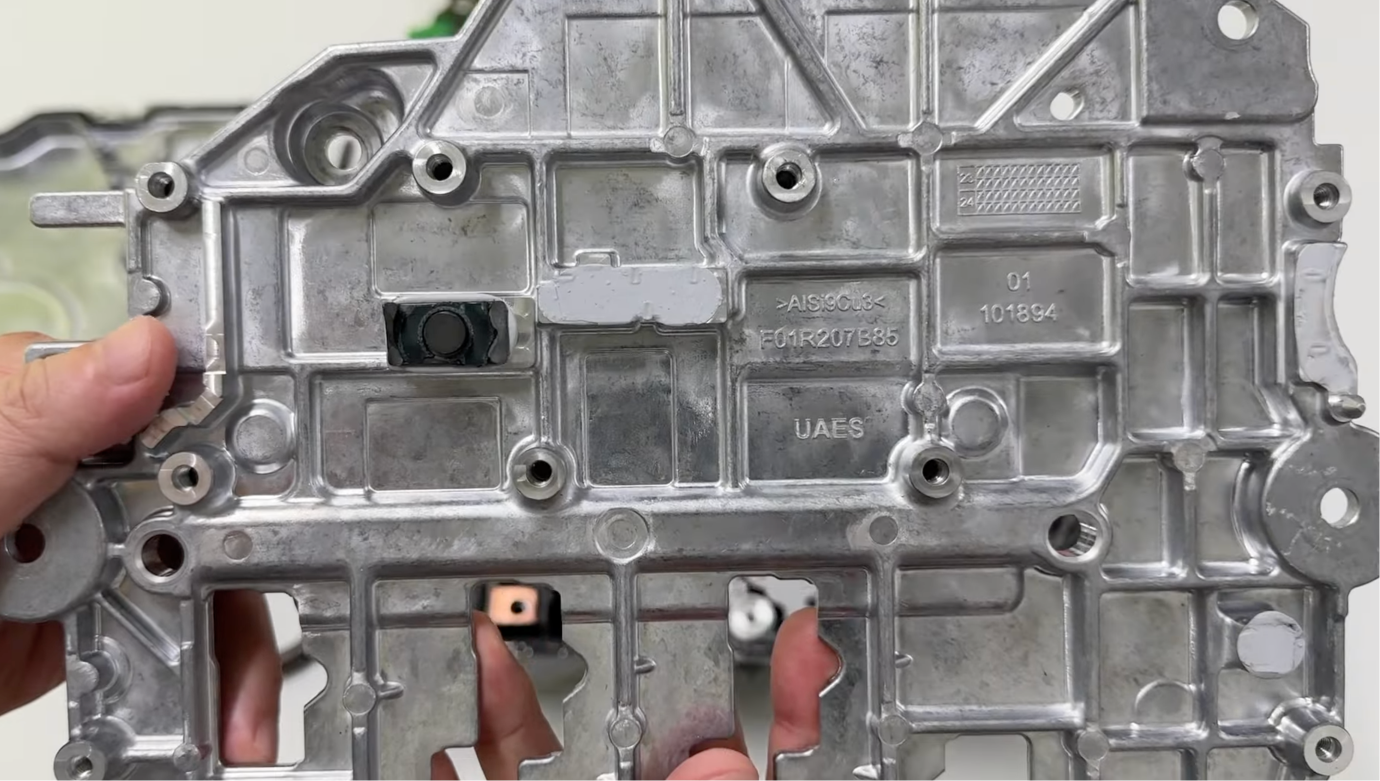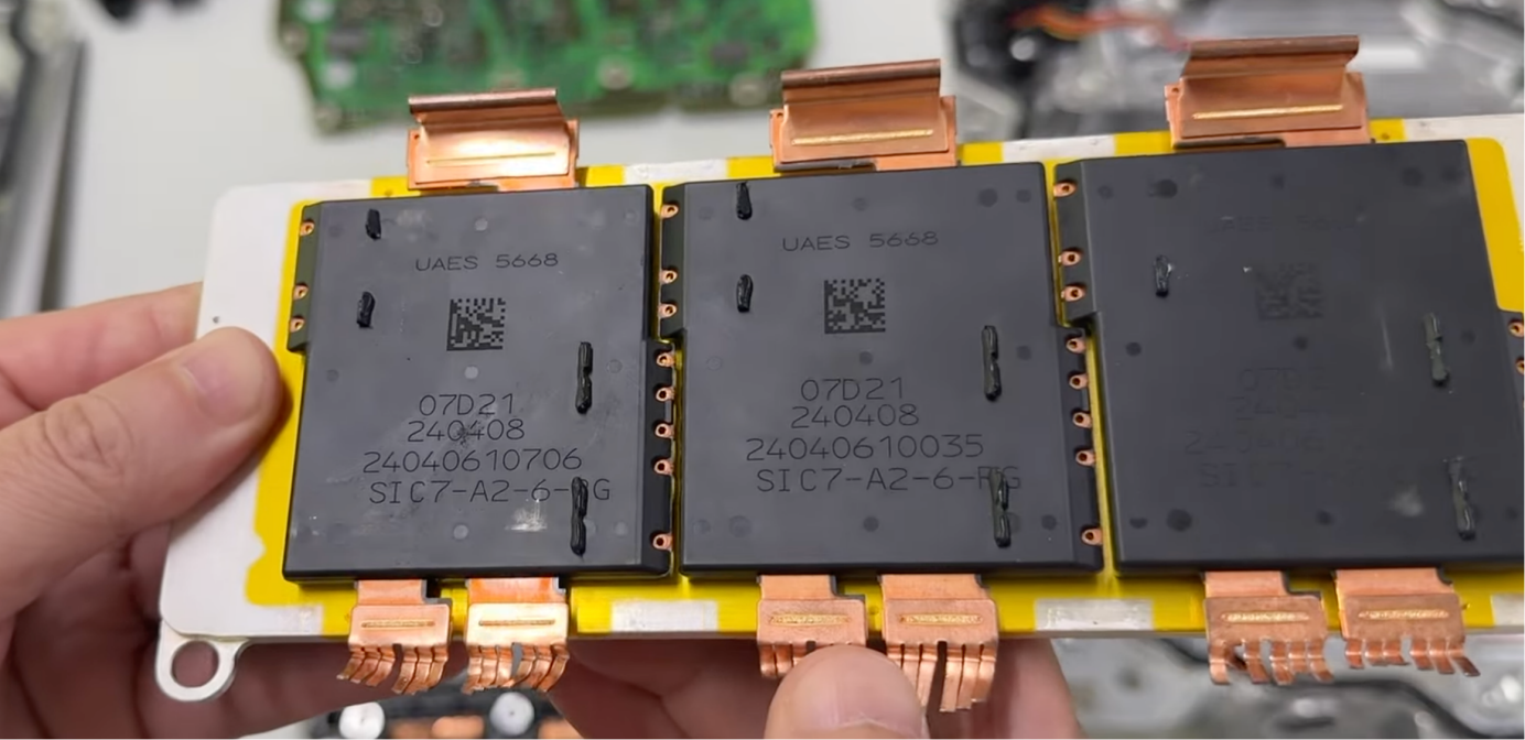 功率器件:搭載3個2 in 1碳化硅(SiC)模塊,模塊體積薄,採用緊湊式封裝,表面印有「UAES」(聯合汽車電子)標識。