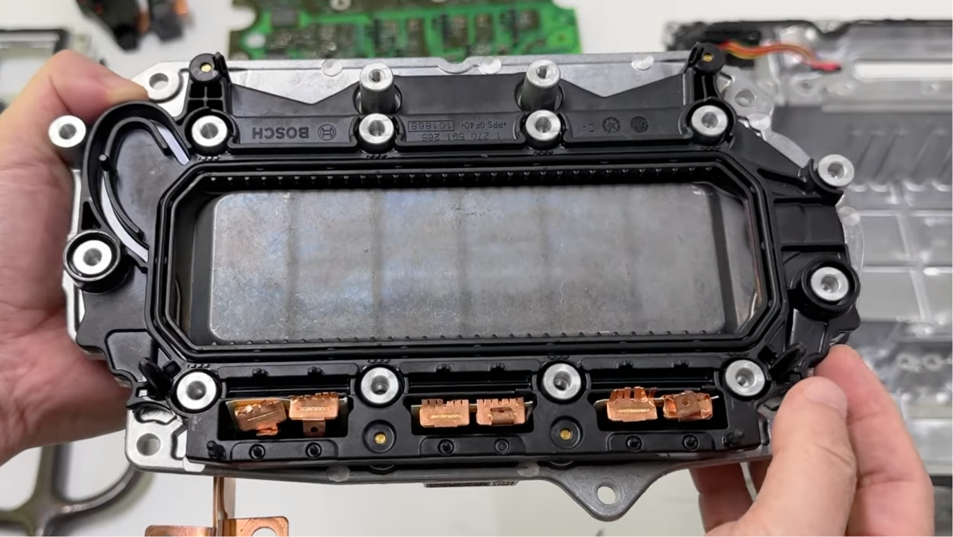 冷卻核心為水路冷卻器,表面印有「博世」標識,內部設計專用水路,冷卻液從指定路徑流過,直接為功率模塊與電容降溫。