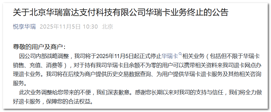 今天上午,支付機構華瑞富達在其官方的微信公衆號上發佈公告,終止了預付卡業務。