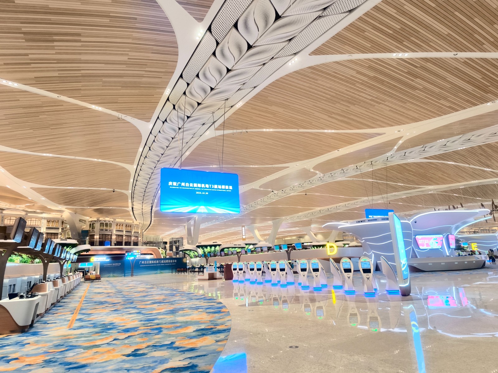 作為中國民航和廣東省的重點建設項目,廣州白雲國際機場T3航站樓總建築面積約42萬平方米,總投資537.7億元,是「十四五」規劃時期落實《粵港澳大灣區發展規劃綱要》「建設世界級機場羣」要求的國家重點交通樞紐工程。T3航站樓的啓用,標誌着白雲國際機場正式邁入「三樓五跑道」新時代,年旅客吞吐能力預計突破1.2億人次,將成為全球領先的超大型航空樞紐。