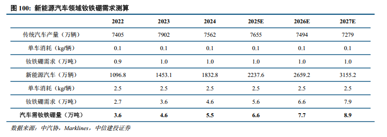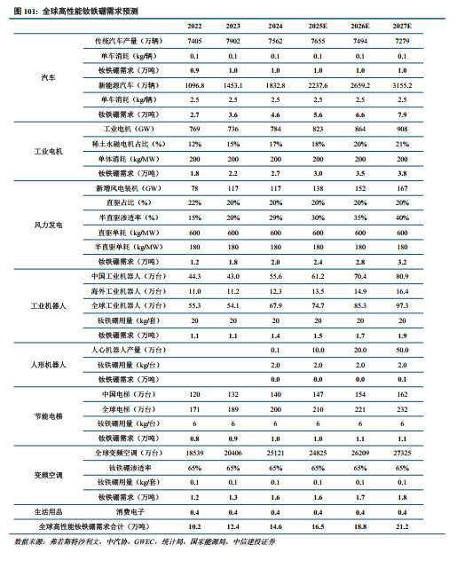 新能源汽車是高性能釹鐵硼材料需求拉動最明顯的領域,未來需求佔比約50%。釹鐵硼永磁材料是新能源汽車永磁驅動電機的核心製造材料,預計2026年全球新能源汽車產量將增長至超2600萬輛,對應釹鐵硼永磁材料需求量將達到6.6萬噸,汽車領域對釹鐵硼總需求量接近8萬噸,是高性能釹鐵硼材料的第一大需求來源,佔高性能磁材需求總量的約三分之一。新能源汽車領域將成為高性能釹鐵硼永磁材料最旺盛的下游需求。