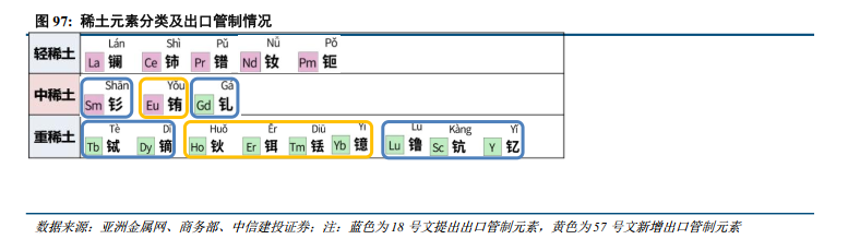 稀土全產業鏈出口管制,大國博弈凸顯配置價值。由於中國具備全產業鏈稀土優勢,海外稀土消費依賴於從中國進口,短期內難以被替代,因此在應對國際貿易爭端中,具有更強話語權。2025年4月4日,商務部聯合海關總署印發2025年第18號文,對釤(Sm)、釓(Gd)、鋱(Tb)、鏑(Dy)、鑥(Lu)、鈧(Sc)、釔(Y)等7類中重稀土實行出口管制政策;2025年10月9日,繼續印發56號文、57號文、61號文、62號文,新增5類中重稀土出口管制,並增加了對設備、技術、原輔材料等出口管制措施。
