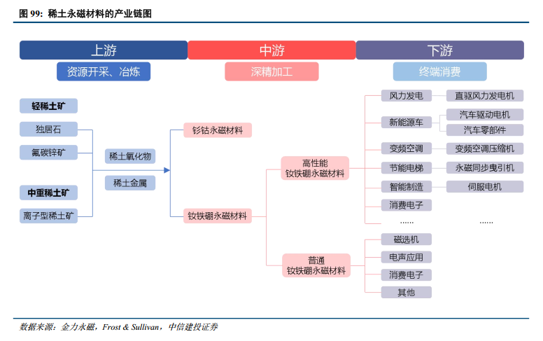 優勢在我,具備稀土全產業鏈優勢。中國是全球最大的稀土資源國、礦/冶生產國、消費國,具備稀土全產業鏈優勢。其中,據USGS數據,中國稀土資源儲量約佔全球40%,且南重北輕,擁有較為豐富的、戰略價值更高的中重稀土資源;中國稀土礦產量約佔全球70%。此外,中國稀土冶煉分離和磁材加工產能優勢更加突出,也是全球唯一一個具備全產業鏈佈局的國家。