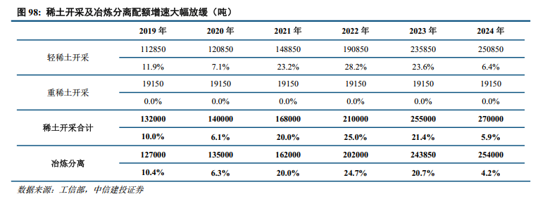 配額增速放緩,基本面進一步改善。由於新能源產業發展,2021至2023年稀土配額增速均保持在20%以上的增速,導致過剩局面;2024年配額增速大幅回落至5.9%,配額增速重回個位數,並低於消費增速,行業週期見底,逐步走向平衡。