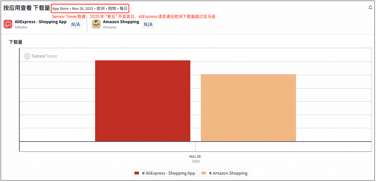 個體的選擇匯聚成了宏觀數據的變動——應用分析平臺 Sensor Tower 監測數據顯示,2025年黑色星期五開賣首日,速賣通在歐洲市場的下載量超越亞馬遜。