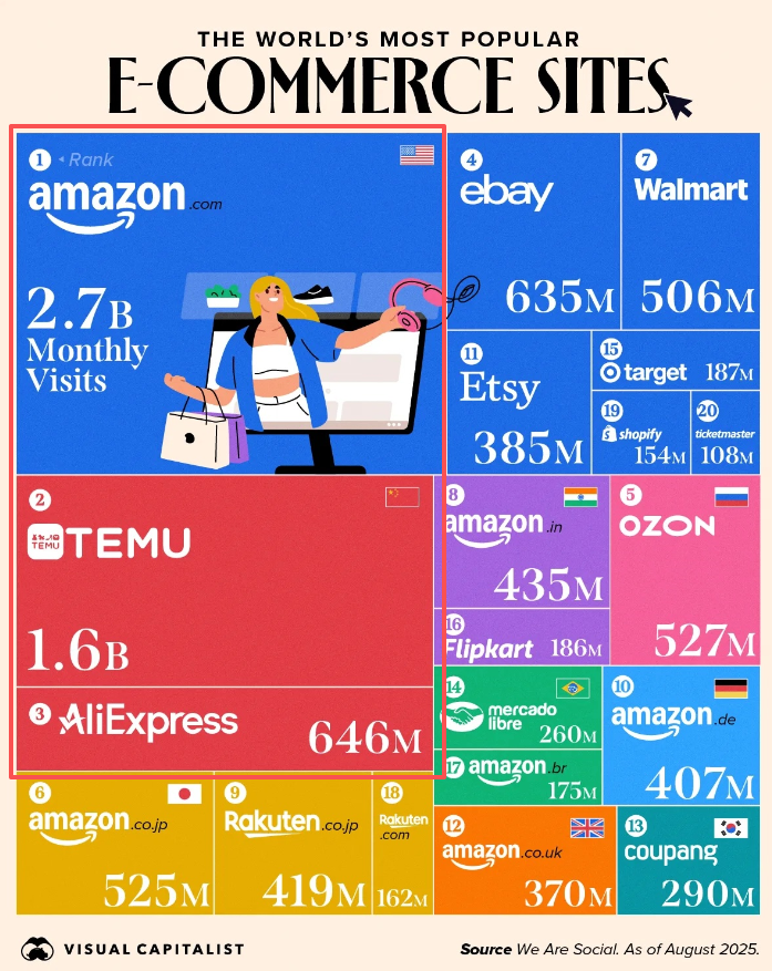然而,商業分析媒體 VISUAL CAPITALIST 的數據顯示,2025年全球訪問量前三大電商平臺已演變為亞馬遜、Temu 和阿里速賣通三足鼎立。
