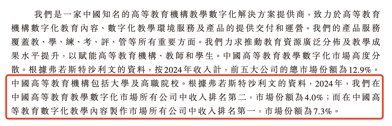 根據弗若斯特沙利文的資料,2024年,公司在中國高等教育教學數字化市場所有公司中收入排名第二,市場份額為4.0%;而在中國高等教育數字化教學內容製作市場所有公司中收入排名第一,市場份額為7.3%。
