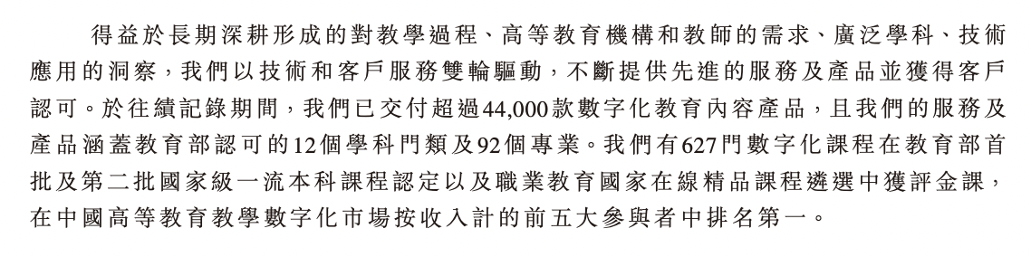 於往績記錄期間,卓越睿新已交付超過4.4萬款數字化教育內容產品,且公司的服務及產品涵蓋教育部認可的12個學科門類及92個專業。其中,有627門數字化課程在教育部首批及第二批國家級一流本科課程認定以及職業教育國家在線精品課程遴選中獲評金課。