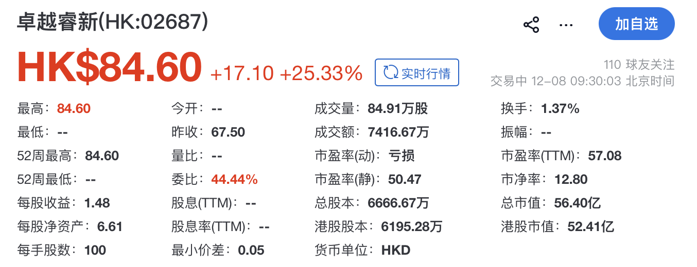 樂居財經 吳文婷12月8日,卓越睿新(02687.HK)在港交所掛牌上市,農銀國際為其獨家保薦人。其開盤報84.6港元,漲25.33%,總市值約56.4億港元。