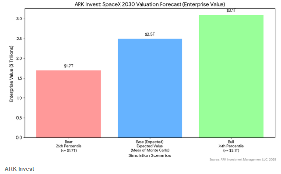 該模型提供了三種可能的估值情景:基礎情景為 2.5 萬億美元,悲觀情景為 1.7 萬億美元,樂觀情景則達到 3.1 萬億美元。這些預測展示了因戰略舉措而產生的差異,例如衞星的研發與部署,以及最終對火星殖民的重視。