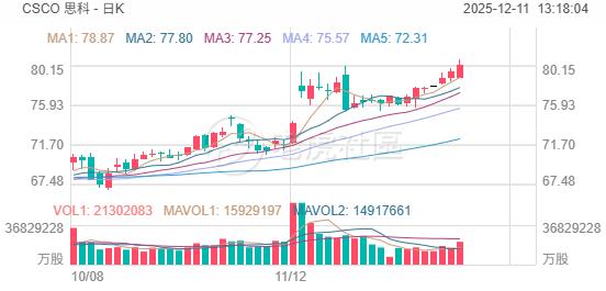 這輪上漲得益於聯儲局連續第三次會議降息後的市場普遍反彈。標普500指數當日上漲0.7%,納斯達克100指數上漲0.4%。思科股價復甦的背後,是其強勁的營收預期以及市場對人工智能支出將加速公司增長的樂觀預期。