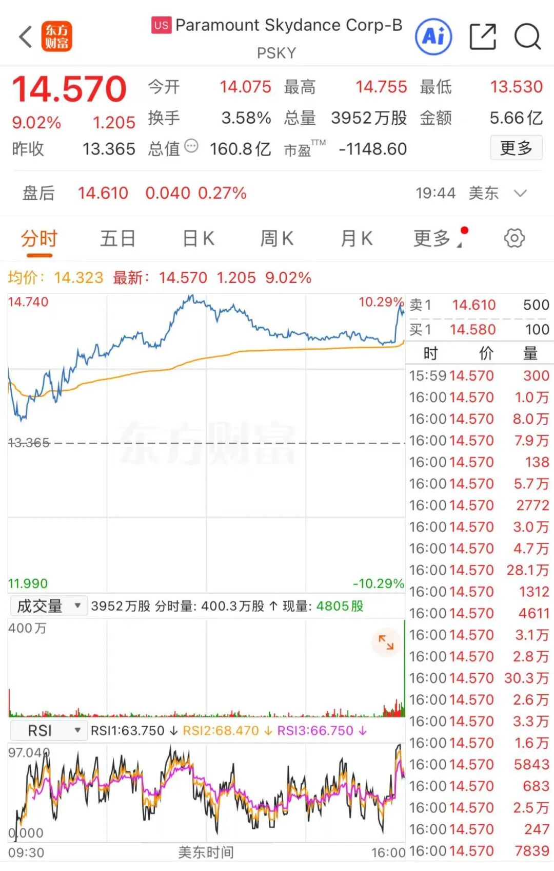 值得關注的是,在華納兄弟與奈飛達成交易幾天之後,當地時間週一,派拉蒙向華納兄弟發起惡意收購要約,提出以每股30美元的全現金方案收購華納兄弟全部股份,價值1084億美元(約合人民幣7660億元)。隔夜,派拉蒙股價大漲9%,華納兄弟股價漲超4%。