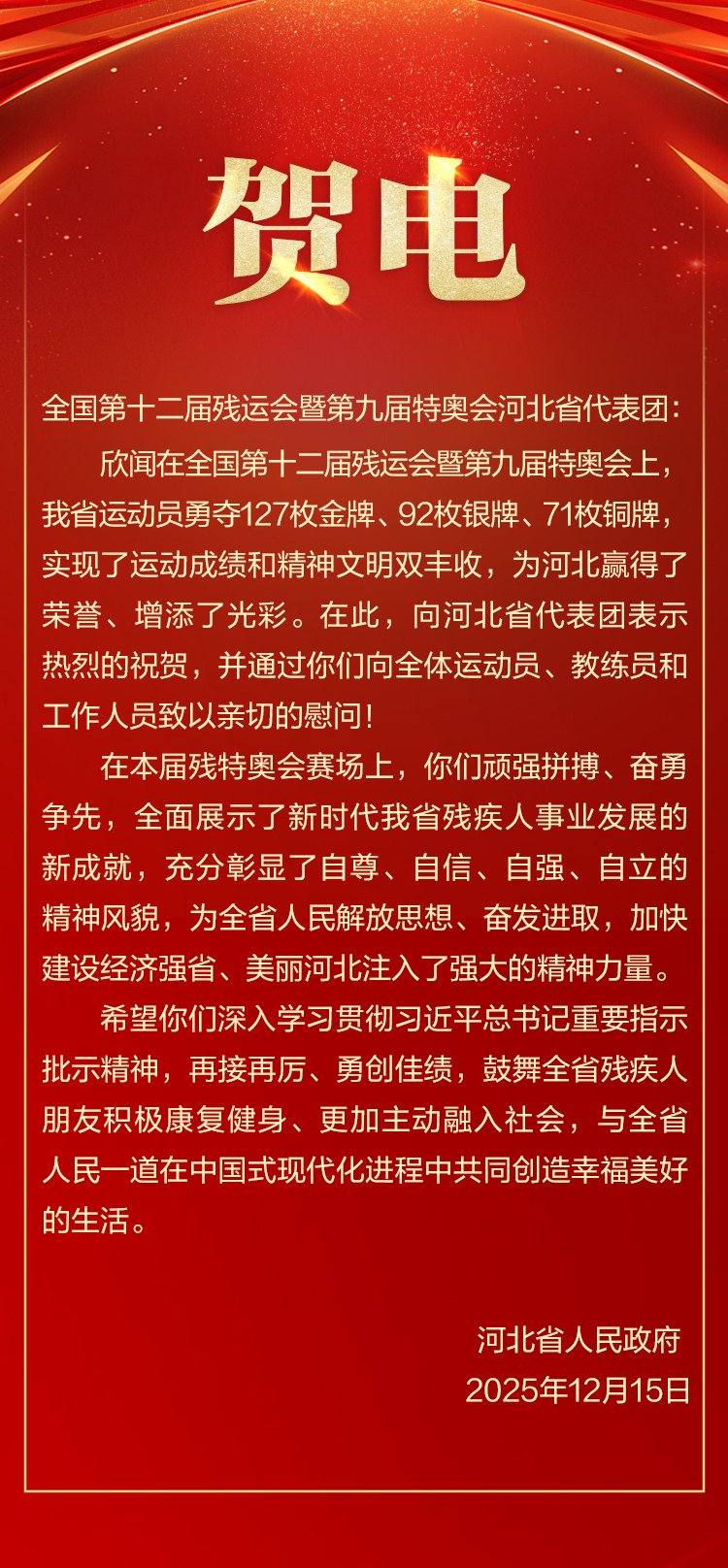 河北省人民政府向全國第十二屆殘運會暨第九屆特奧會河北省代表團致賀電