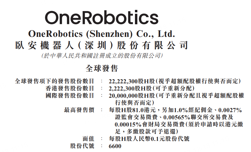臥安機器人(06600.HK)發佈公告,公司擬全球發售2222.23萬股股份,其中香港發售股份222.23萬股,國際發售股份2000.00萬股,另有333.33萬股超額配股權。招股日期為12月18日至12月23日,最高發售價81.00港元,每手買賣單位100股,入場費約8181.69港元。
