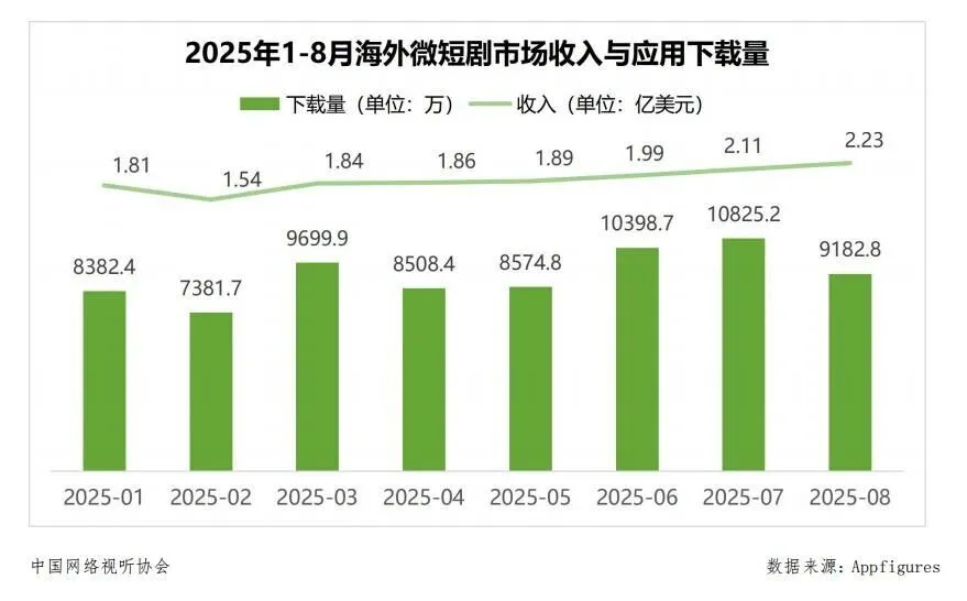 《中國微短劇行業發展白皮書(2025)》數據顯示,2025年1月至8月,海外微短劇市場總收入達15.25億美元,同比激增194.9%。海外微短劇應用總下載量7.3億次,同比增長370.4%。ReelShort、DramaBox兩大頭部平台單季收入均破1億美元,崑崙萬維(維權)DramaWave年化流水破2.4億美元。收入前20位的應用中,90%具有中國背景,創造了91%的市場收入。