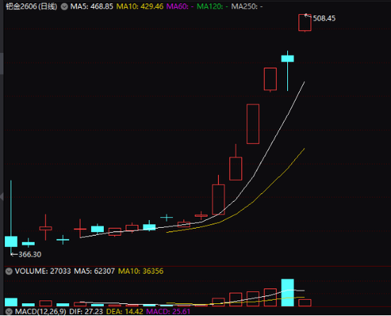 行情數據顯示,當天廣期所鈀期貨主力合約以漲停收盤,報508.45元/克,創出廣期所鈀期貨品種上市以來新高,收盤漲幅達7%。今年12月以來,廣期所鈀期貨主力合約累計漲幅已高達36.22%。