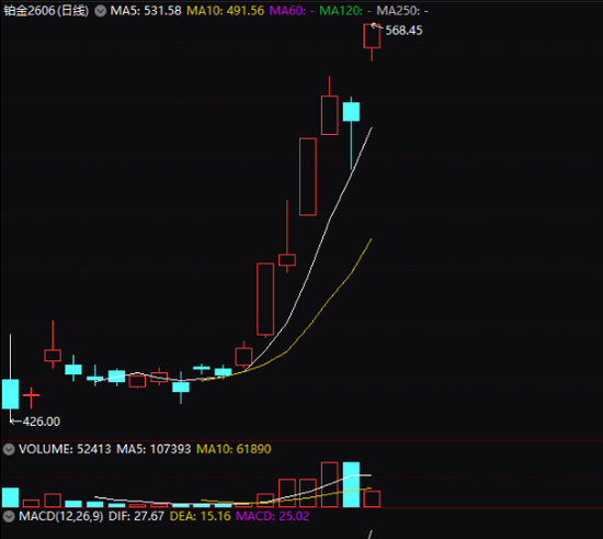 另一貴金屬——鉑的期貨價格也大漲。12月22日,廣期所鉑期貨主力合約也以漲停價收盤,收盤漲幅達6.99%,報568.45元/克,創出廣期所鉑期貨品種上市以來新高。今年12月以來,廣期所鉑期貨主力合約累計漲幅已高達30.86%。