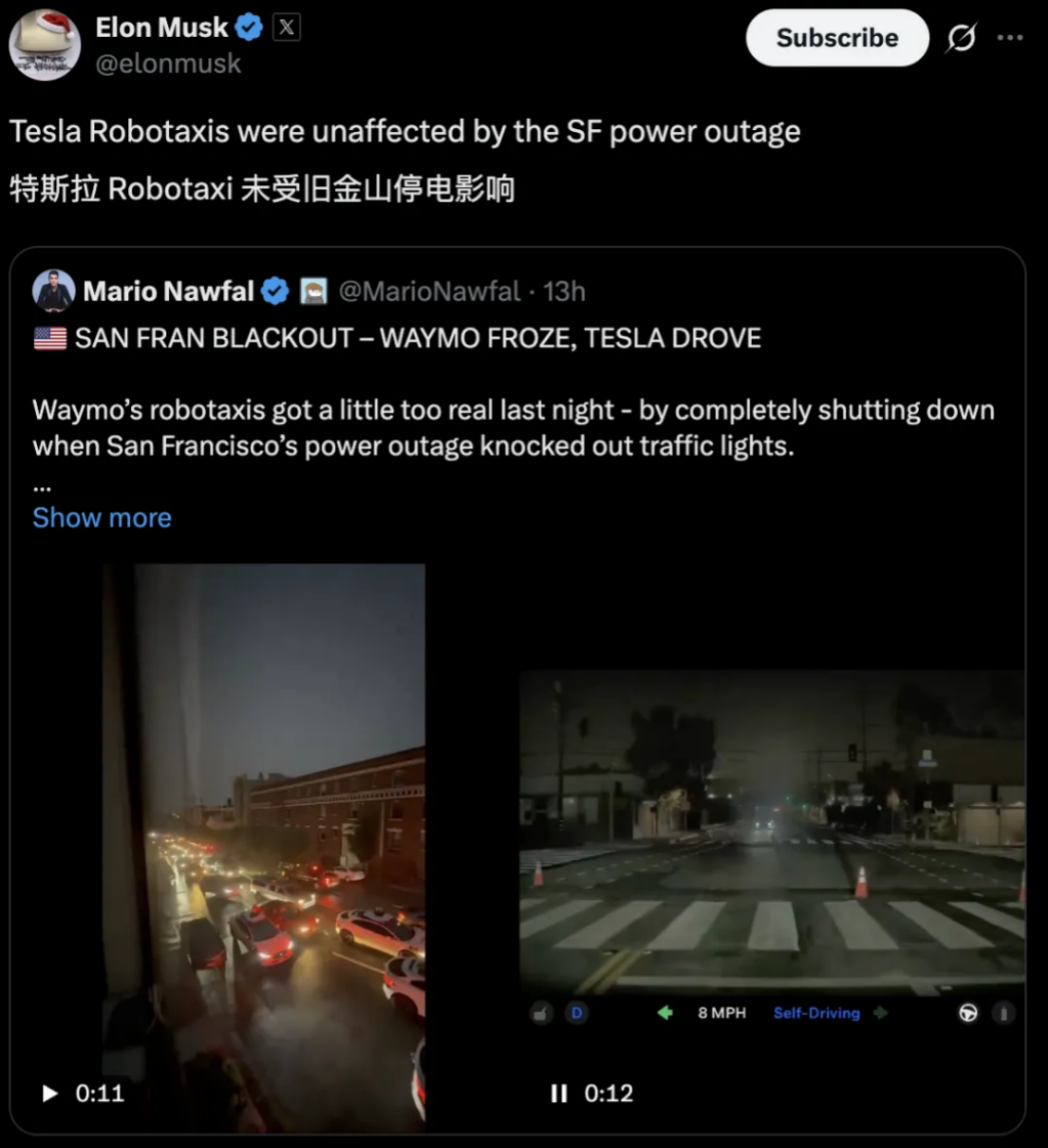 在Waymo陷入困境之際,馬斯克在社交平台X上發文稱「特斯拉Robotaxi未受舊金山停電影響」。