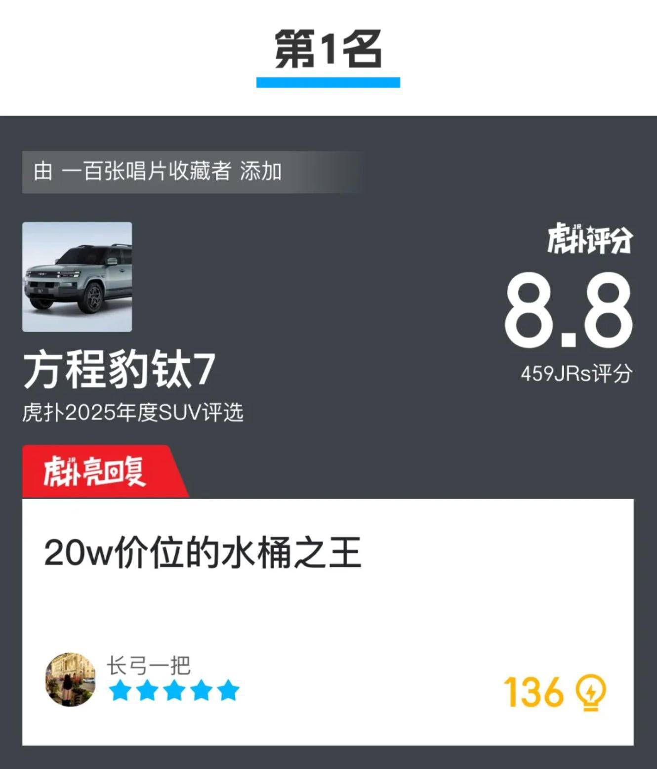 拿了 8.8 分的方程豹鈦 7 穩居榜首,有虎撲網友稱其為「20 萬價位的水桶之王」。