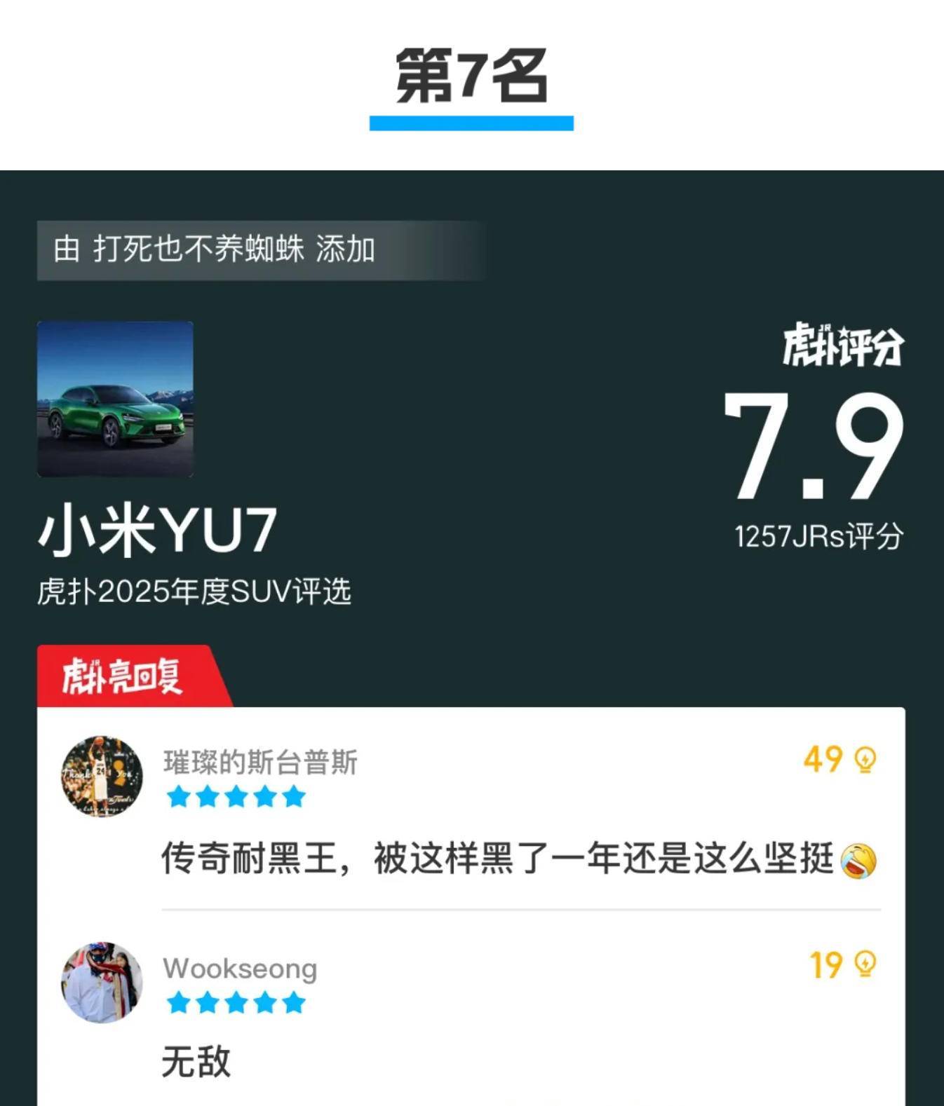 至於那些處於輿論漩渦裏的流量大戶,老哥們的態度也很有意思。拿到 7.9 分的小米 YU7 被封為傳奇耐黑王,評論區覺得黑得越狠越說明含金量。在虎撲這種討論氛圍濃厚的地方,只要車子本身足夠好開或者好看,網上的口水很難擋住大家的熱情。