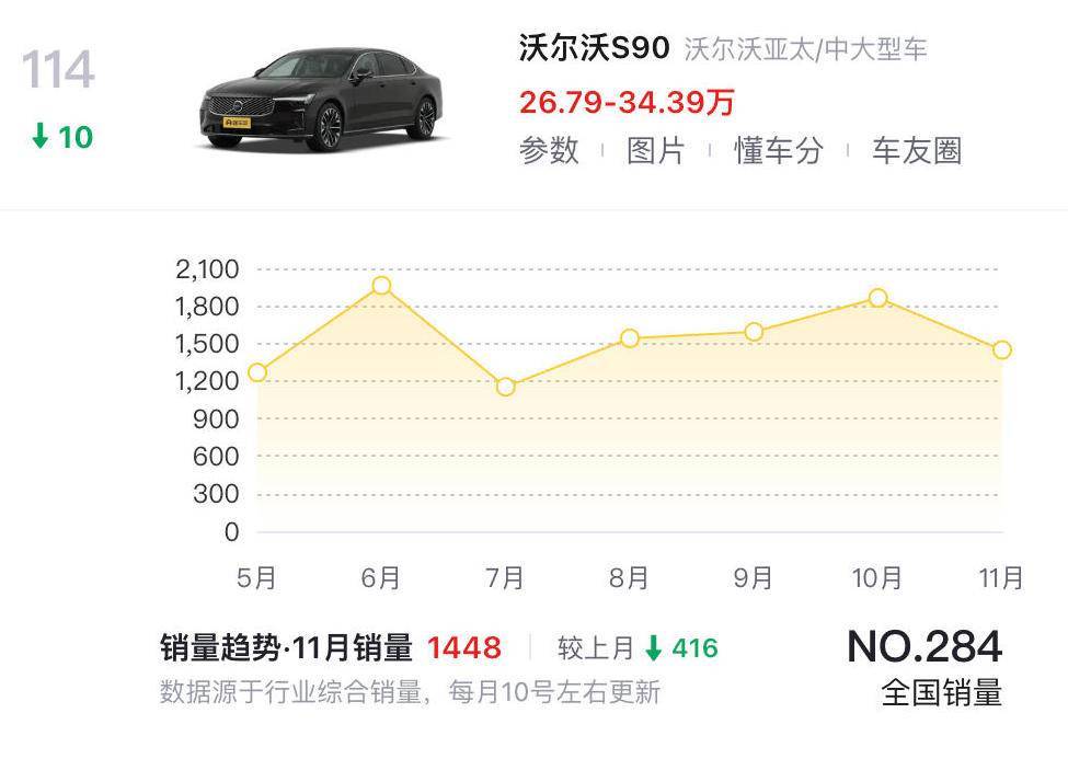 轎車榜的第二名也蠻有意思,沃爾沃 S90 拿到了 8.3 的高分,靠着那股高知、儒雅的格調贏得了老哥們的偏愛。可一旦把數據擺在一起,這份在鍵盤前積累的好感就顯得有些形單影隻,它在市場上的表現甚至賣不過那個在虎撲轎車榜裏排名墊底的百萬級豪車尊界 S800。