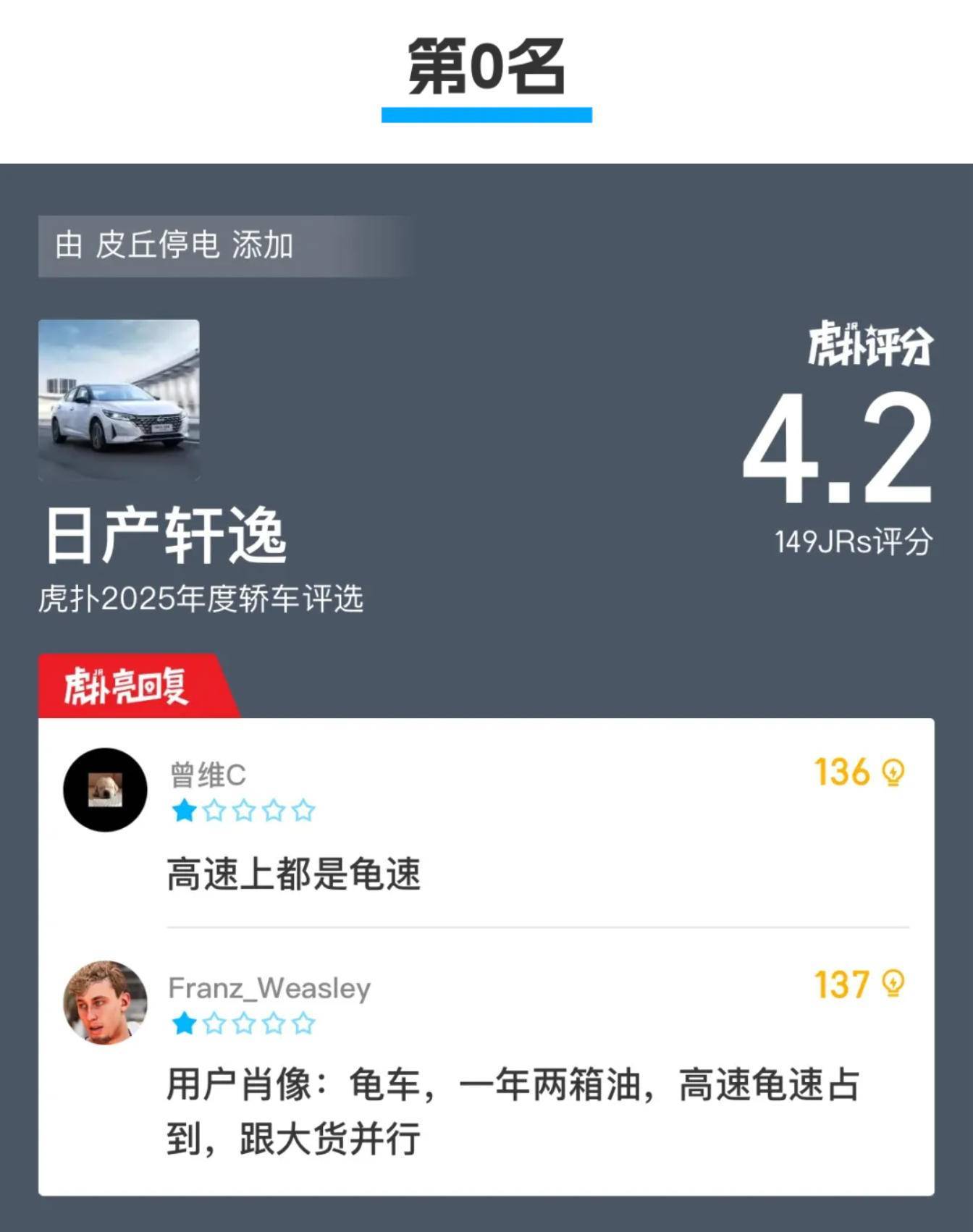 在轎車榜裏,排在最前面的並不是那些常規意義上的豪華座駕,而是一台被封為「第 0 名」的日產軒逸。老哥們毫不客氣地給這台馬路上的常客打出了 4.2 的超低分,並順手給它貼上了「移動路障」的標籤。