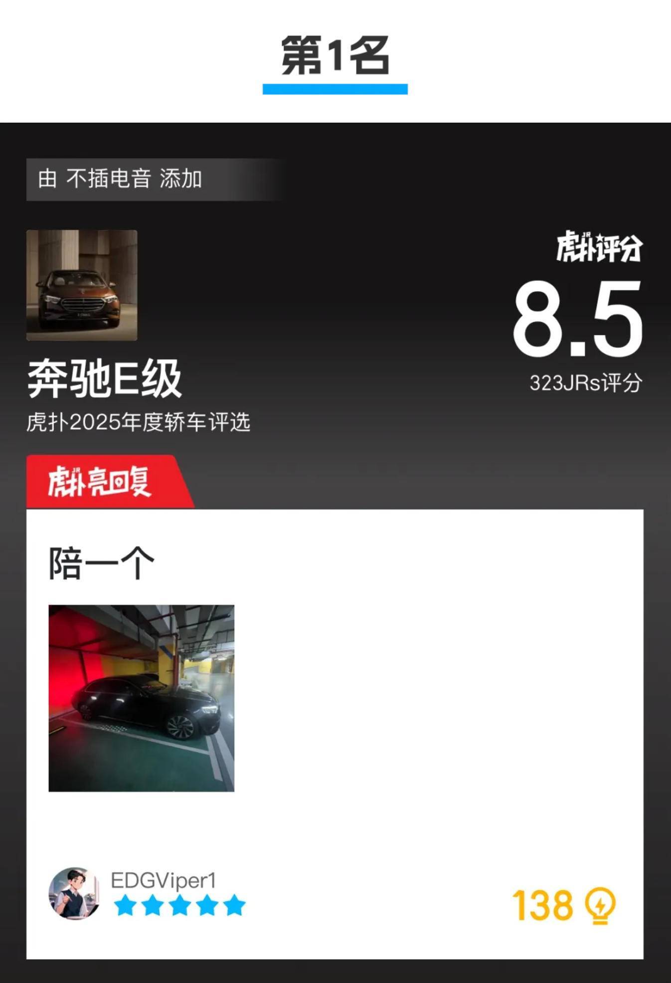 拿到 8.5 分榜首位置的奔馳 E 級,則向我們展示了另一種無法撼動的共識。即便是在這樣一個推崇硬核參數的社區,三叉星輝所代表的成功和排面依然是大家心照不宣的終點。