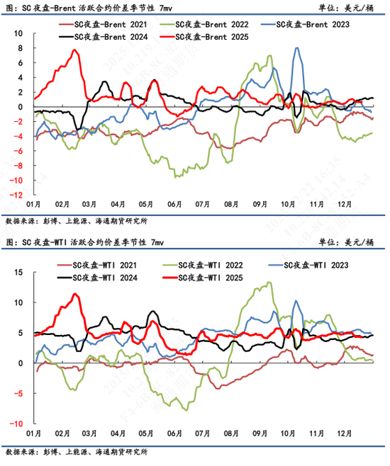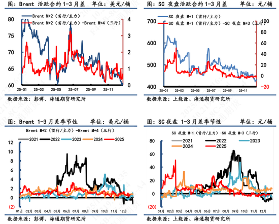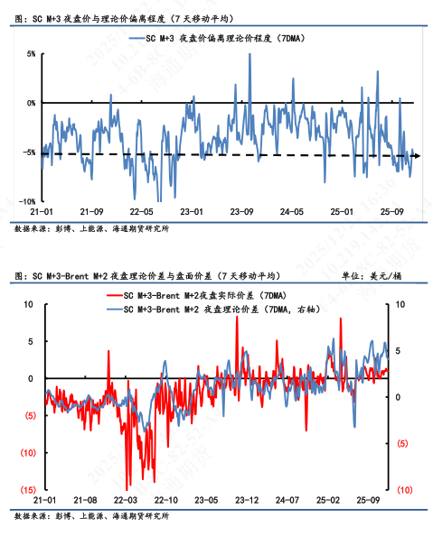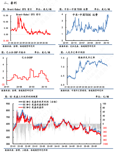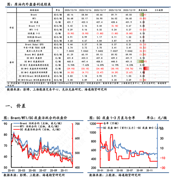 2)套利:①估值:12月19日凌晨2:30,Brent 2602盤面價為59.99美元/桶,SC 2603盤面價為431.9元/桶,測算SC 2603盤面理論價為451.0元/桶,當天盤面估值偏離程度-4.23%。從7天移動平均估值值中,以【-5%,0】為正常區間來看,估值區於常態下沿。②利潤:測算SC2603盤面到岸利潤-18.76元/桶,摺合-2.67美元/桶。③價差:SC2603-Brent2602盤面差為1.03美元/桶,理論差3.69美元/桶,盤面價差低於理論價差。(注:上週Brent首行為2602;SC首行為2602;其中M代表時下12月)