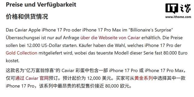 IT之家 12 月 23 日消息,奢侈品定製品牌 Caviar 基於蘋果 iPhone 17 Pro 和 iPhone 17 Pro Max,推出「億萬富翁的驚喜」(Billionaire's Surprise)系列定製版,再次打破手機定價天花板,頂配版售價逼近 8 萬歐元,全球限量 3 件,目前已經售罄。