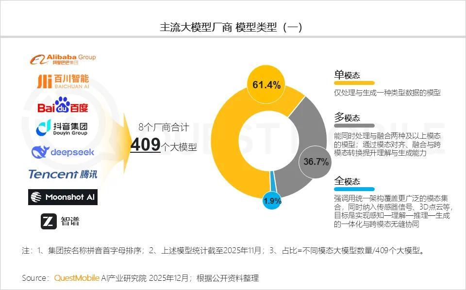 截止到2025年11月,8個主流廠商合計推出了409個大模型,其中,單模態、多模態和全模態佔比分別為61.4%、36.7%、1.9%。這當中,多模態交互已經逐漸成為主流,「多模態輸入」到「單模態輸出」佔比高達73.3%。