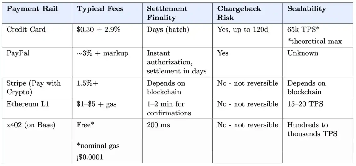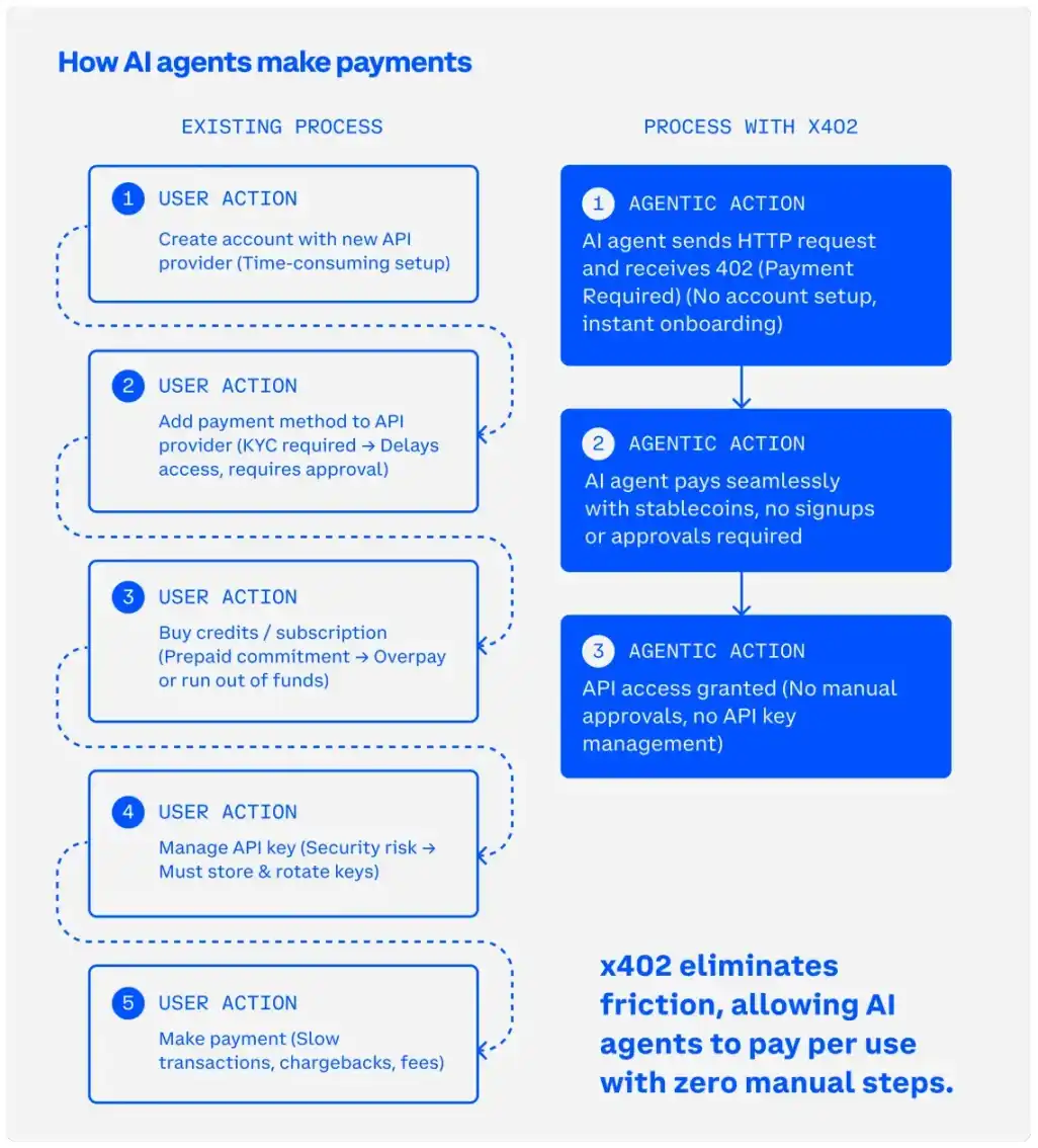 藉助 x402,代理可以精確支付當下所需。例如,花 2 美分看一篇付費文章,或支付幾分之一美分進行一次 API 調用。交易在鏈上幾秒內即可結算,無需建立長期關係。