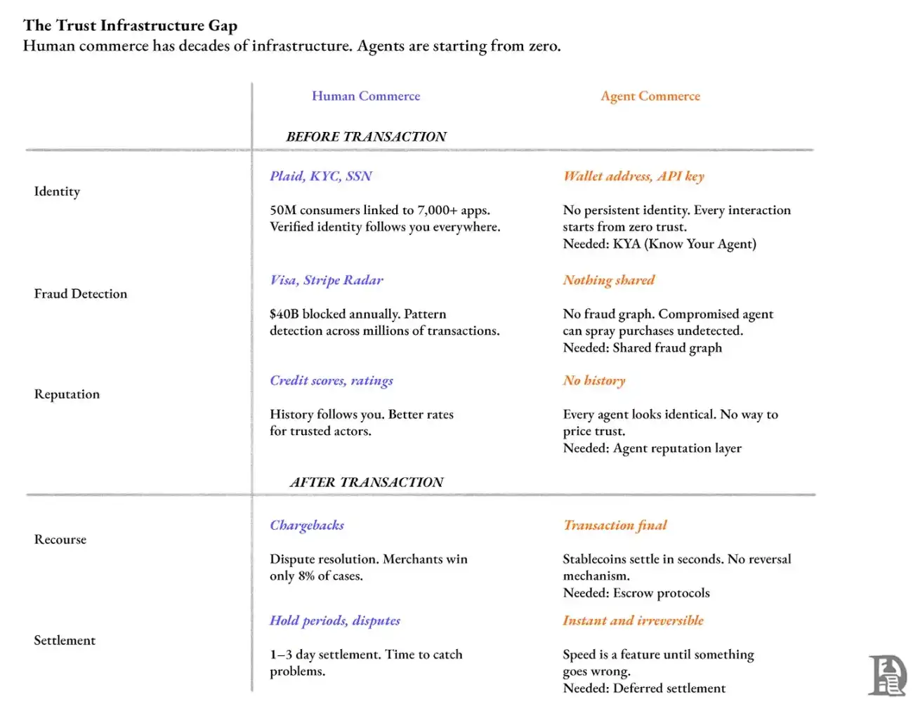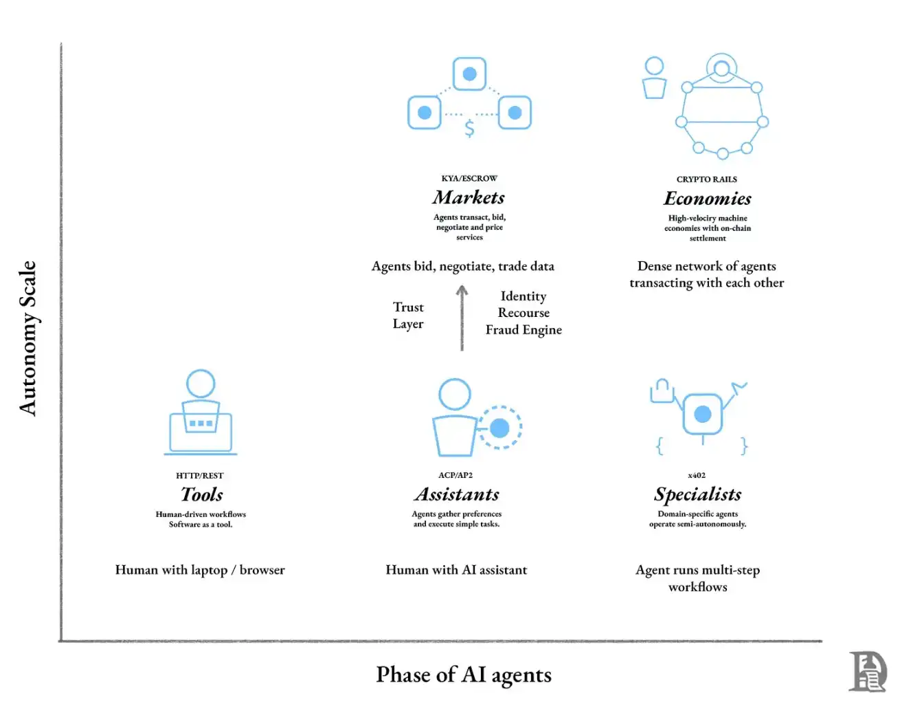 因此,我們面臨選擇:是讓傳統金融基礎設施繼續其緩慢結算,還是有意識地構建信任基礎設施來匹配快速的區塊鏈結算?前者將限制代理潛力,後者則是機遇,也是自主代理商業發展的必然延伸。
