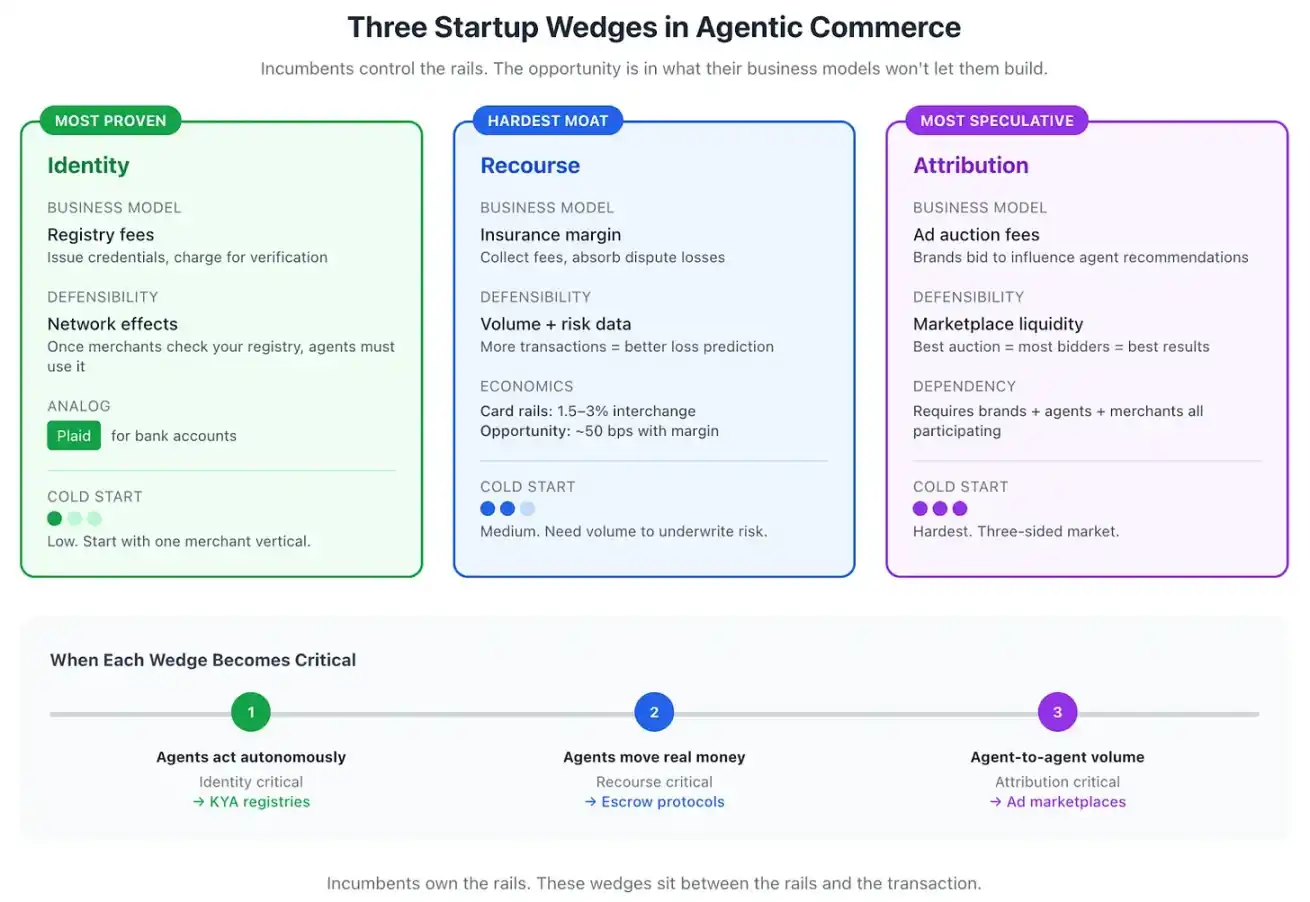 代理身份 最直接。註冊模式已被驗證。雖然 Plaid 是經典案例,但很貼切:他們為銀行賬戶做了身份驗證。初創公司可以為代理做同樣的事:頒發憑證、積累信譽、讓商戶在收款前查驗信譽分。其護城河來自網絡效應:一旦足夠多商戶通過你的註冊表查驗,代理就不得不保持良好的信譽記錄。