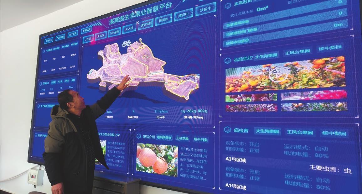 「我們的中控室大螢幕上,可以實時查看園區每一個角落的情況,無人機正在進行植保作業的畫面也清晰可見。」鄧文巖介紹,「過去管理500畝傳統果園可能需要幾十人,現在依靠這套智慧系統,只需要4到5名技術管理人員就能輕鬆應對。」