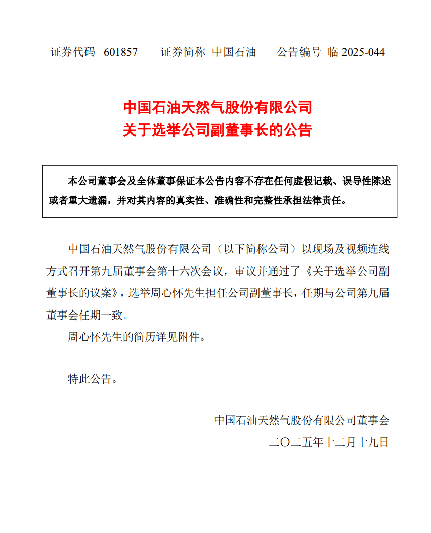 中國石油天然氣股份有限公司(以下簡稱公司)以現場及視頻連線方式召開第九屆董事會第十六次會議,審議並通過了《關於選舉公司副董事長的議案》,選舉周心懷先生擔任公司副董事長,任期與公司第九屆董事會任期一致。