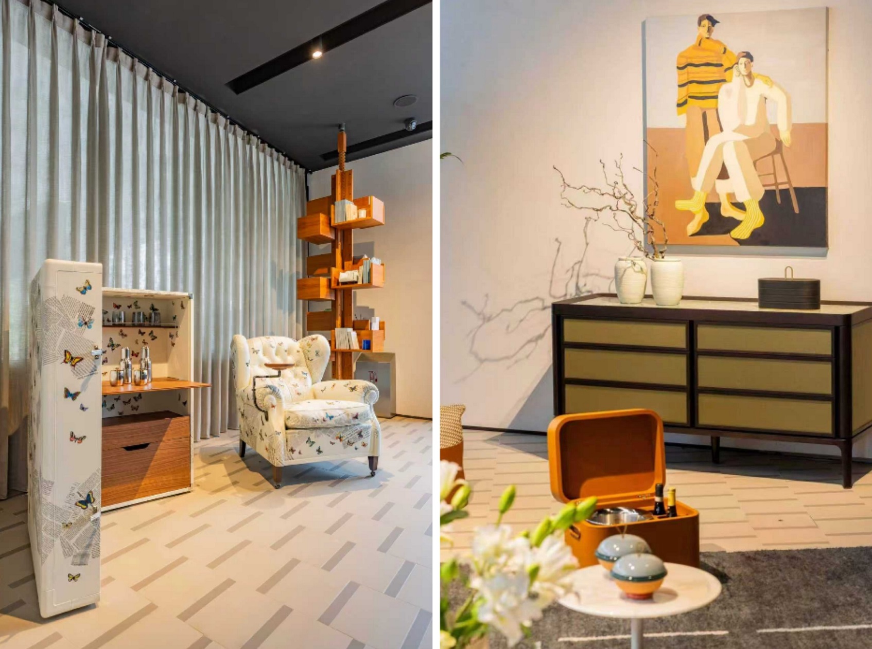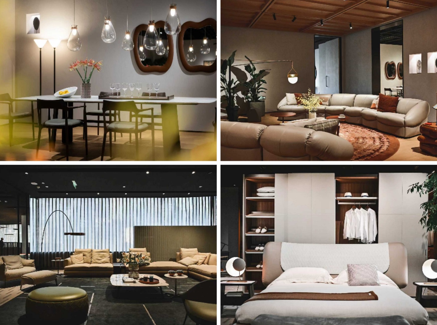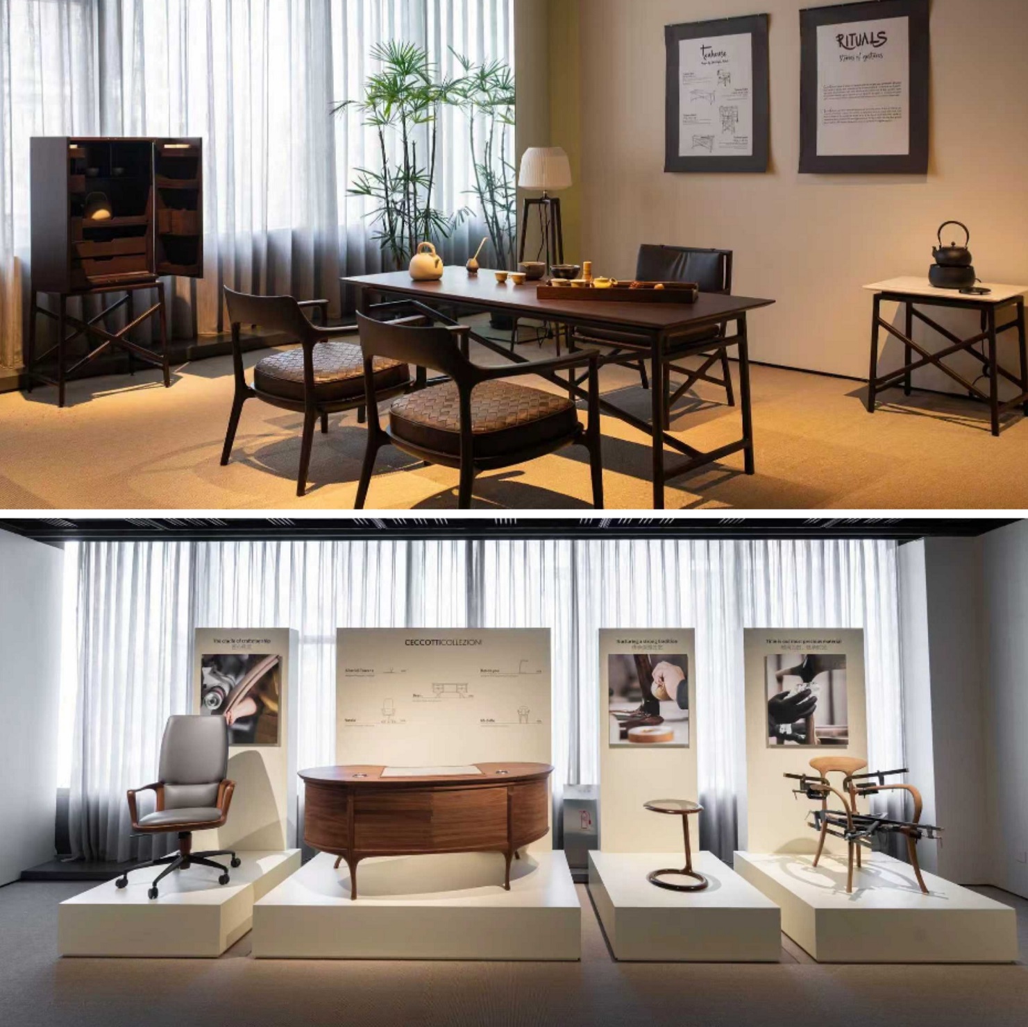 目前展廳的核心亮點之一,是旗下高端原木傢俱品牌Ceccotti Collezioni的獨立展陳。源自托斯卡納的木藝智慧,以其雕塑般的曲線與精湛工藝,重新詮釋了東方茶室場景,在保留意大利設計精髓的同時,自然呼應本土生活儀式。同步呈現的雙品牌博物館,則透過皮藝與木藝兩條工藝脈絡,串聯起跨越百年的匠心傳承。