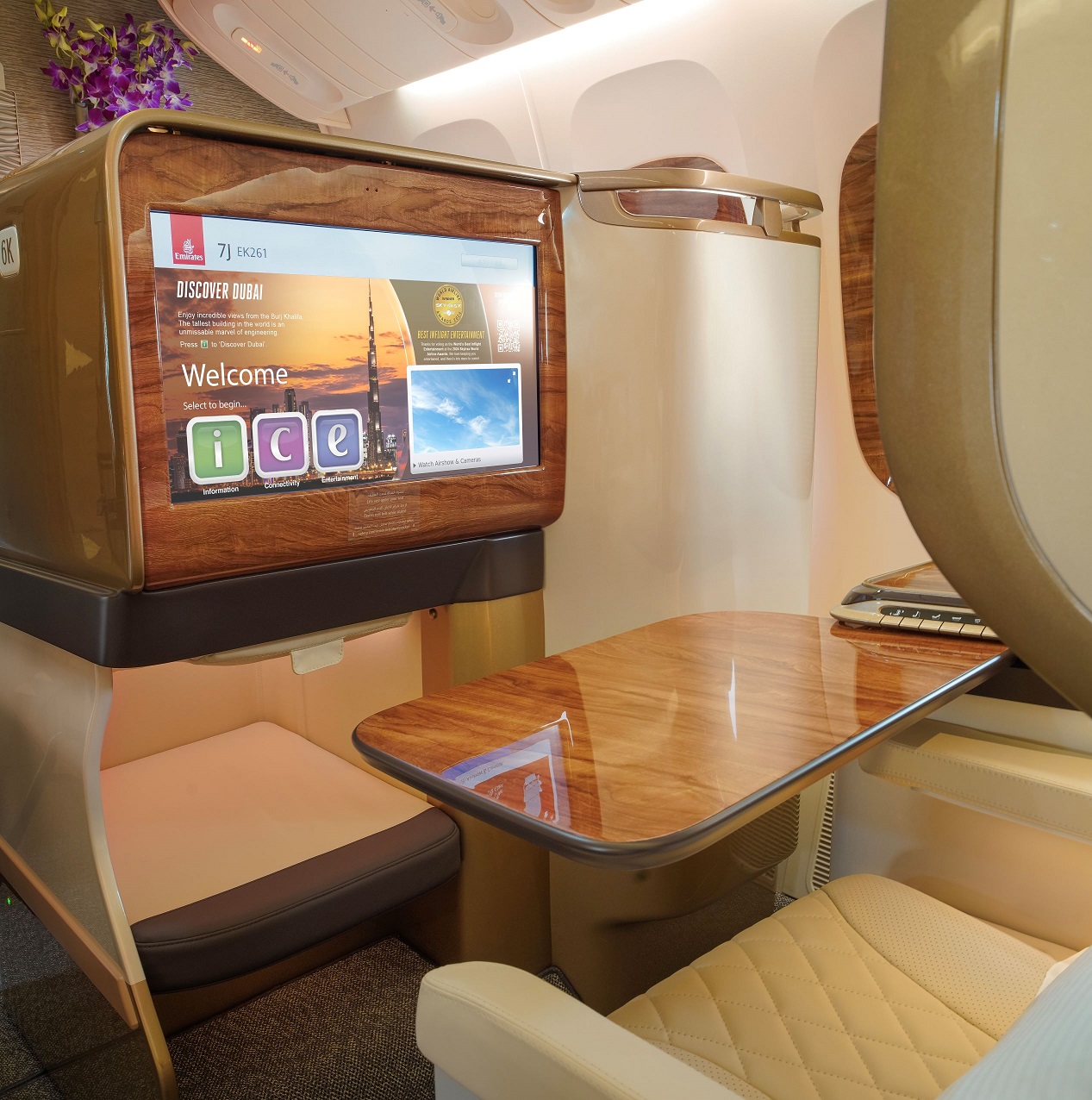 商務艙亦經過全新設計,座椅採用1-2-1佈局,兼顧私密性、直通過道的便利性以及充裕的工作、休閒與休息空間。每個座椅均採用香檳色皮革包裹,與最新款阿聯酋航空A380上的座椅材質一致,並配有精緻的縫線和柔軟的緩衝頭枕。頭等艙私人包間以其煥然一新的內飾,將持續呈現乘客所期待的旗艦級舒適、私密與奢華體驗。