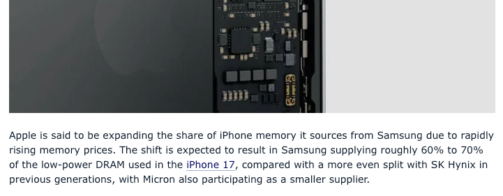 受存儲芯片價格快速上漲的影響,蘋果正擴大其iPhone存儲芯片從三星的採購佔比。據外媒稱,在iPhone 17所使用的低功耗動態隨機存取存儲器(DRAM)供應中,三星有望佔據約60%至70%的份額。而在此前幾代iPhone產品裏,三星與SK海力士的供應比例相對均衡,美光也作為較小供應商參與其中,如今這種平衡已被打破。