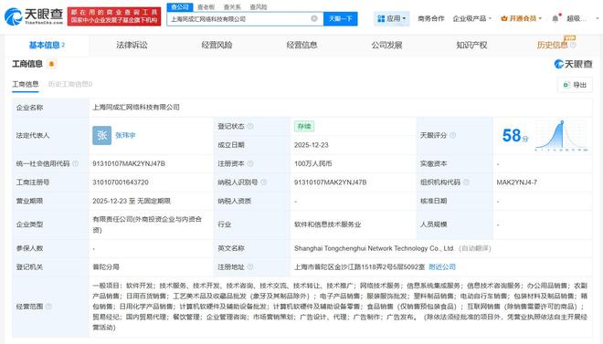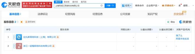 雷達財經訊,天眼查工商信息顯示,近日,上海同成匯網絡科技有限公司成立,法定代表人為張瑋宇,註冊資本100萬人民幣,經營範圍包括軟件開發、電子產品銷售、互聯網銷售、國內貿易代理、餐飲管理等。股東信息顯示,該公司由淘寶閃購關聯公司拉扎斯網絡科技(上海)有限公司及旗下浙江一錠橙網絡科技有限公司共同持股。