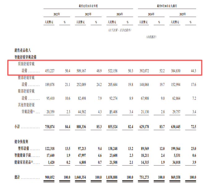 從細分產品來看,未來健康核心產品主要是肩頸舒緩穿戴設備,近年來收入佔比超過40%。值得關注的是,2025年前三季度,未來健康該品類收入同比出現下滑。根據招股書,2025年前三季度,公司來自肩頸舒緩穿戴設備收入為3.85億元,同比下降1.85%,營收佔比為44.3%。