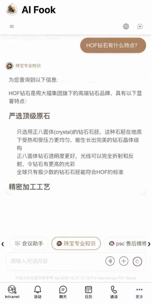 通用智能體「阿福」就像「企業版豆包」,它不僅可以提供知識問答,還支持文案創作、文生圖、文生視頻、多語言翻譯等多元化的AI服務,還精通珠寶專業知識。