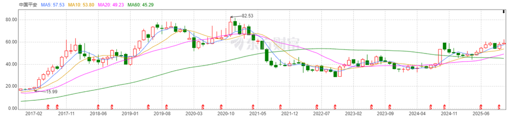 現在與2017年的情況有一點相同的是,2017年上漲之前,經歷了兩年的熊市行情,如今也是經歷了2022-2024年的下跌,2024年Q4到2025年漲幅明顯。如果歷史重演,平安未來還有較大空間創新高。