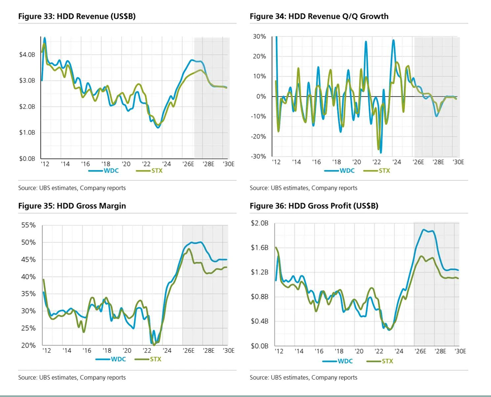 瑞銀分析師團隊表示,短期可聚焦於兩大堪稱壟斷的HDD霸主——即希捷與西部數據公司,可把它們共同當作「存儲景氣度周期類型短期交易主題」,中長期把超額收益押在Memory(HBM、高端DDR、以及數據中心企業級SSD背後的NAND/控制器生態)的供需缺口與定價權上——這與當前AI數據中心擴張正在把HBM與傳統DRAM/NAND推向更強烈的供需失衡相一致,也就是說三大存儲芯片原廠主導的定價與供給紀律只會導致供需愈發失衡,且2028年纔有可能出現有意義的供給緩解。