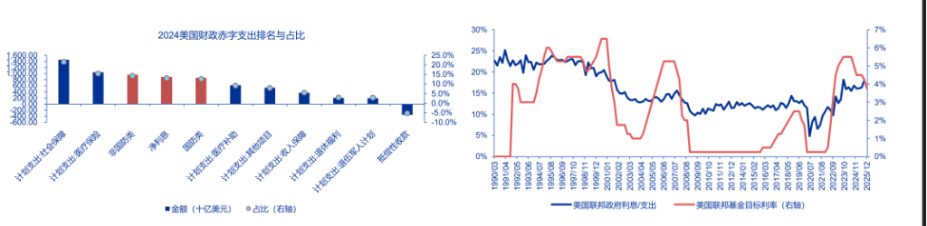 財政赤字的「緊箍咒」:2024年數據顯示,利息支出已佔美國聯邦財政支出的18%。如果長端利率失控,美國財政部將面臨災難性的償債壓力。美債利率期限溢價易上難下,聯儲局若拋售美債,將是搬起石頭砸財政部的腳。