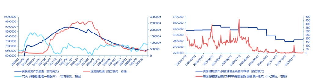 流動性枯竭風險:美國貨幣市場的流動性已至臨界點。準備金餘額大幅下降,隔夜逆回購(ONRRP)使用量基本歸零。此時如果貿然激進縮表,只會引發回購市場的劇烈動盪。